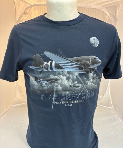 - Adult C-47 t-shirt with detailed graphics of the aircraft in group formation with invasion markings. Additional aircraft in background.