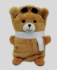 The Aviator bear blanket opens up to 44 x 30 inches. When rolled up the Bear stands 10 inches. Very soft and cuddly, the bear has his flight goggles and scarf. Just undo the strap in the back and the bear will roll out to a blanked any child will love to cuddle with.